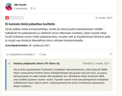 Ei tämä RMA omalla kohdallanikaan ihan putkeen ole mennyt. Rikkoutuneen virtalähteen tilalle tarjotaan edelleen ensin joko lahjakorttia tai vaihtoa välirahaa vastaan. Kun kumpaankaan en suostu ja haluaisin mieluummin hyvityksen suoraan rahana, pitäisi minun nyt hyväksyä tilalle eri valmistajan huonompi virtalähde. Viesteihin vastataan nopeimmillaan joka toinen päivä, minkä takia asian käsittely venyy, ja nyt ei ole viikkoon kuulunut mitään. Eikö tämä takuu lopulta mene Corsairin piikkiin, vai miksi verrattain vaatimattomasta summasta pitää käydä tällainen vääntö?